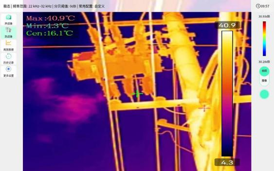 配置超声波成像摄像头, 实时生成声像云图, 定位故障声源;采用64/128MEMS Mic通道设计,多点捕捉,检测定位更准确,检测频率范围2kHz-48kHz; 配置云台,角度可调,监测范围和角度更大, 适合更多场景应用;
