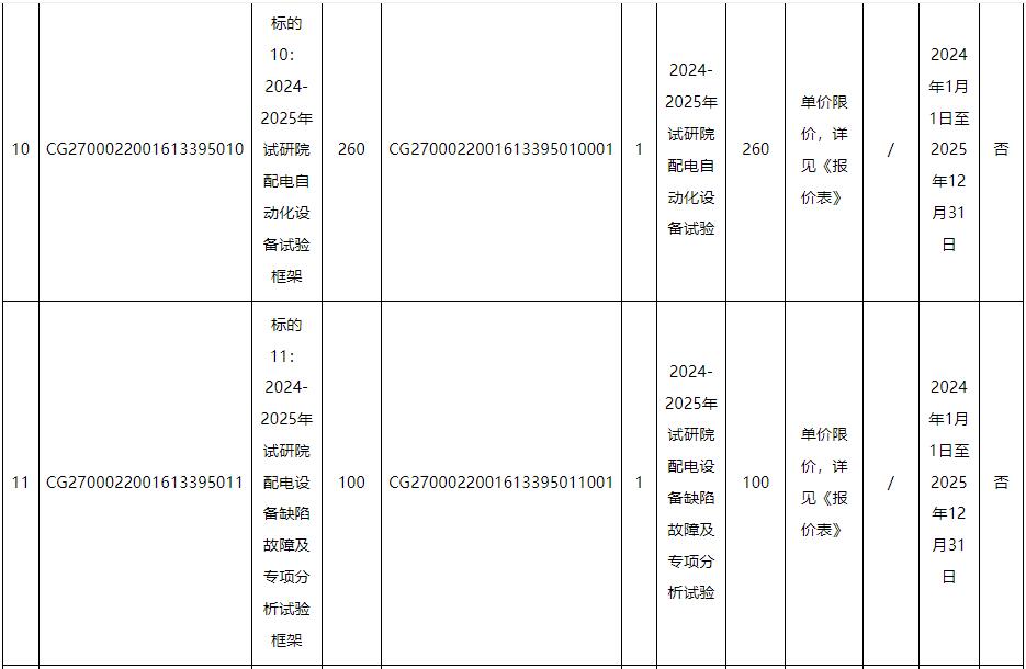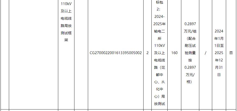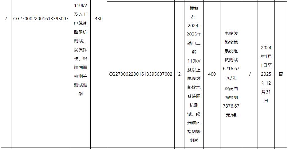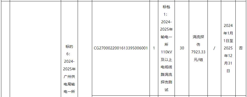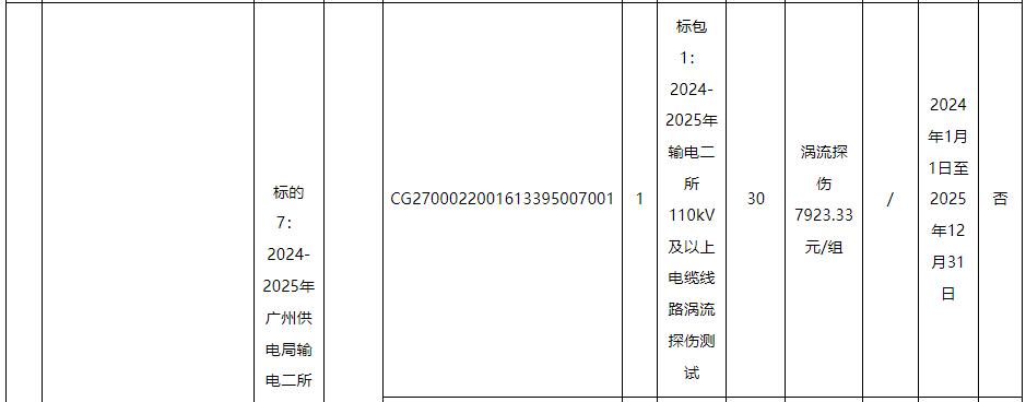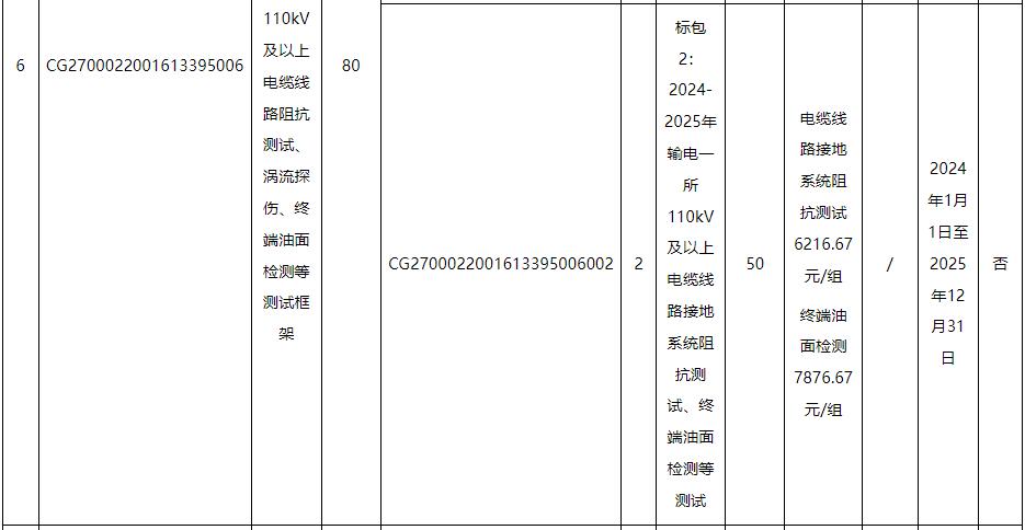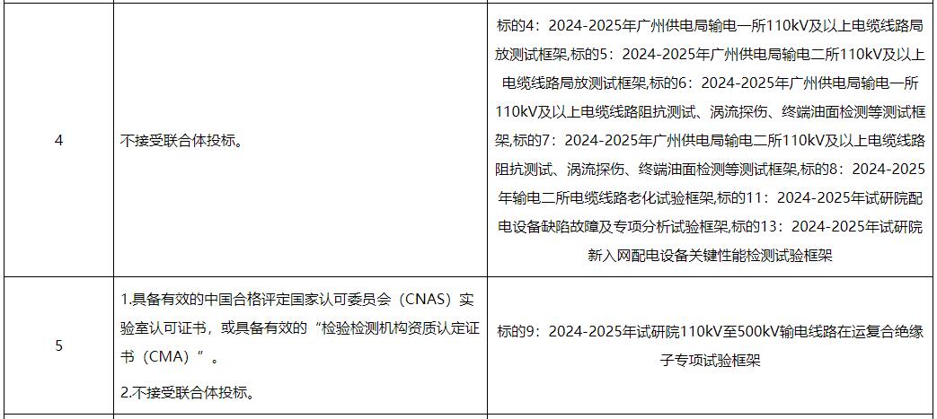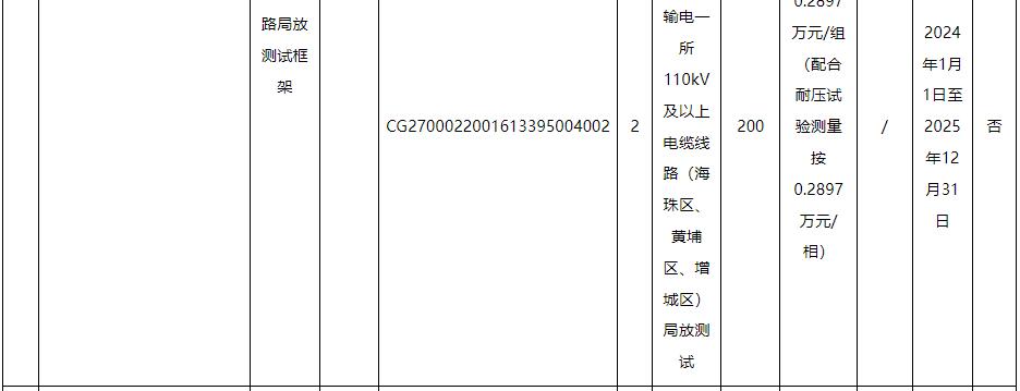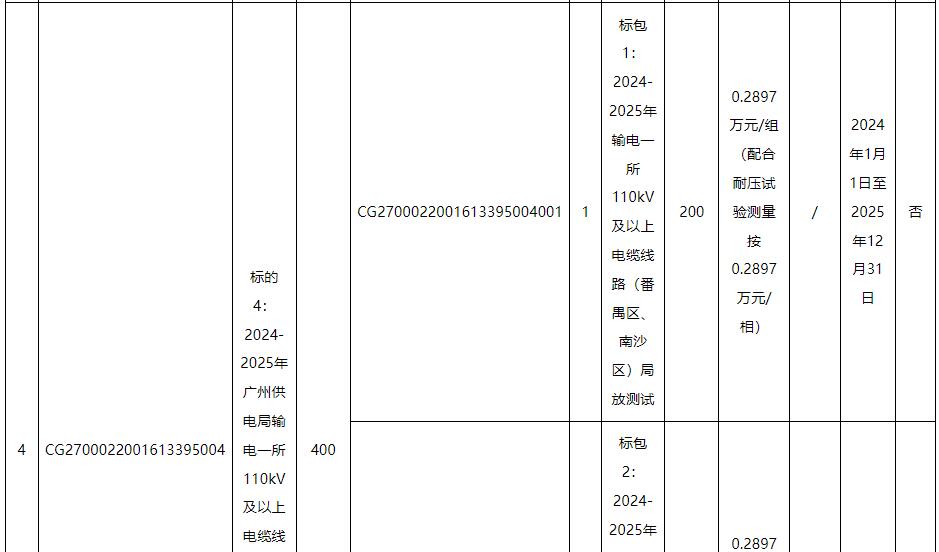 标的4、5∶包括:广州供电局输电管理所110kV及以上电缆线路局放测试,项目内容对完成输电管理一、二所电缆及电缆附件局放测试并出具相关检测报告。含附井开井、清淤、施工现场围敝、办理工作票,每个点测量时间不得少于20分钟,如检测有疑似局放,需完成不少于2次复测。电缆耐压试验局放测试,应采用分布式局放测试系统,测量时间与耐压试验时间一致。
