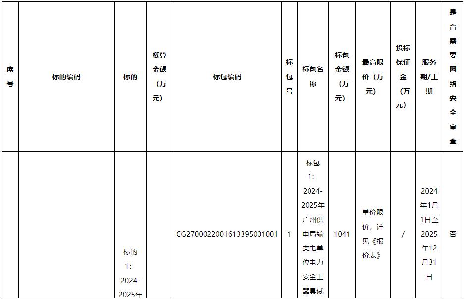 标的1:包括对广州供电局电力安全工器具,依照国家、行业、南网标准相关试验项目技术要求,定期进行预防性试验(包括绝缘和力学[含登高、起重)两类),提供检测、上门运输、送回指定地点及检测分析、检测技术等相关服务。