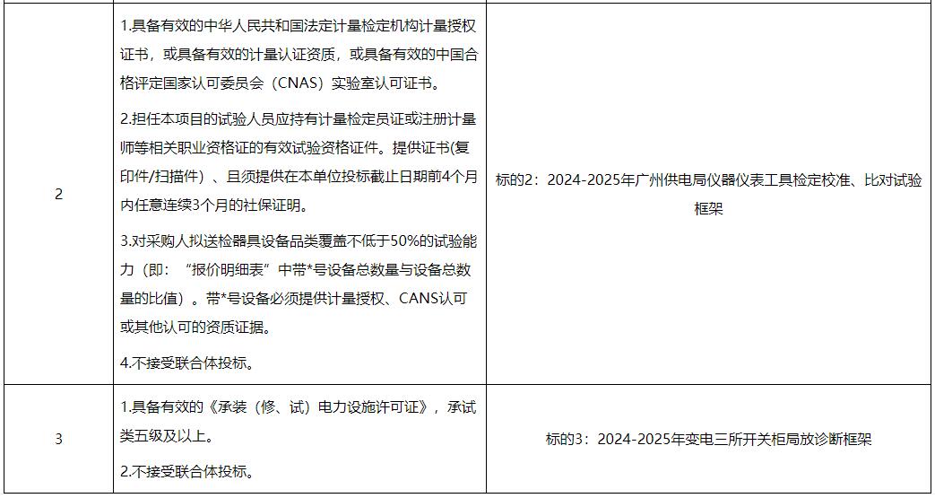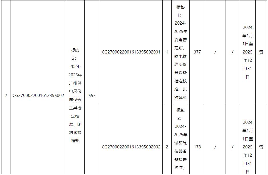 标的2:对广州供电局各主网单位包括但不限于电工仪器仪表、校验标准设备、检测设备,按电力行业质量标准要求,依照国家、行业、南网标准相关试验项目技术要求,定期进行检定、校准、检测,并对技术数据分析和检测编写试验报告。提供上门运输、送回指定地点等相关服务。