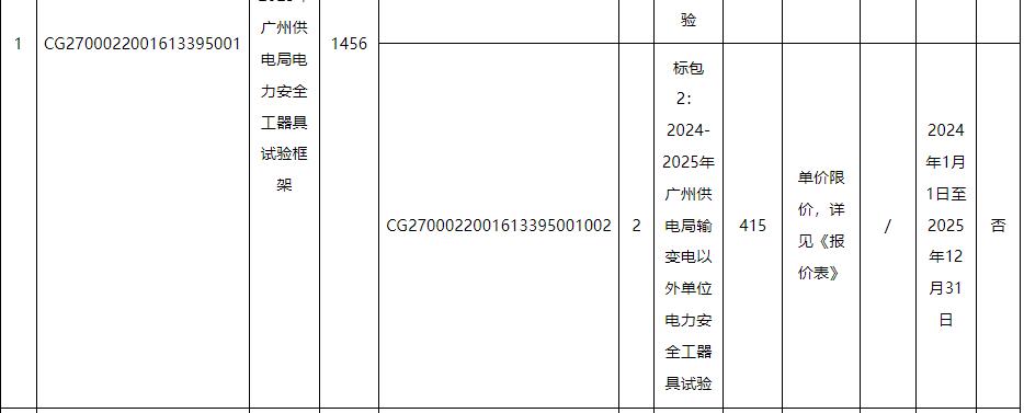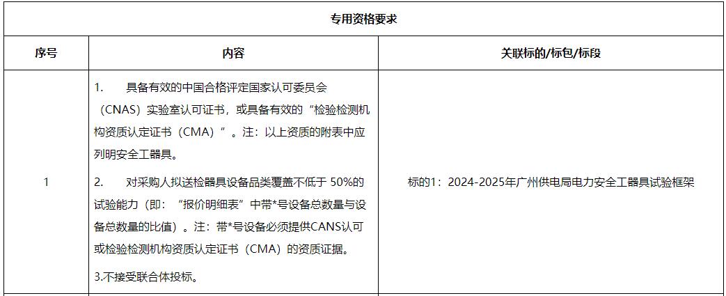 本招标项目2024-2025年广州供电局电力安全工器具试验、输变电设备仪器等试验项目框架(招标项目编号:CG2700022001613395),招标人为广东电网有限责任公司广州供电局,项目资金来自自筹资金,出资比例为100%。该项目已具备招标条件,现对本项目进行公开招标。