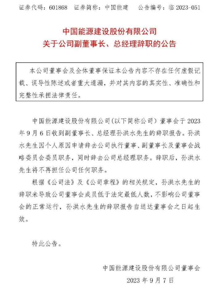 2023年9月6日,中国能建公告,孙洪水辞职,将不再担任公司任何职务。