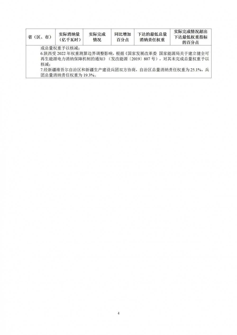 北京等26个省(自治区、直辖市)完成了国家能源主管部门下达的最低总量消纳责任权重,其中17个省(自治区、直辖市)达到激励值;新疆整体区域总量消纳责任权重为23.5%,其中新疆维吾尔自治区实际完成为25.1%,新疆生产建设兵团实际完成为19.3%;上海、重庆、陕西3省(直辖市)因自然原因和统计口径调整,依规核减未完成的权重。